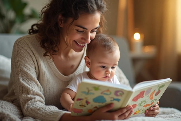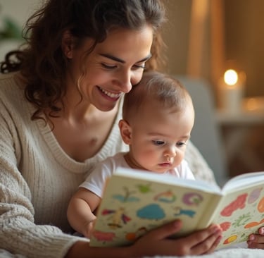 Livros com imagens pequenas e nítidas favorecem a fixação visual e fortalecem o vínculo entre cuidador e bebê.